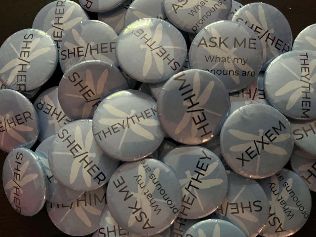 Provide me with your brand guidelines and/or your organization’s logo, and I will create several design choices for you to choose from, and physically create the buttons for your team. Pictured below is an example of branded pronoun buttons.